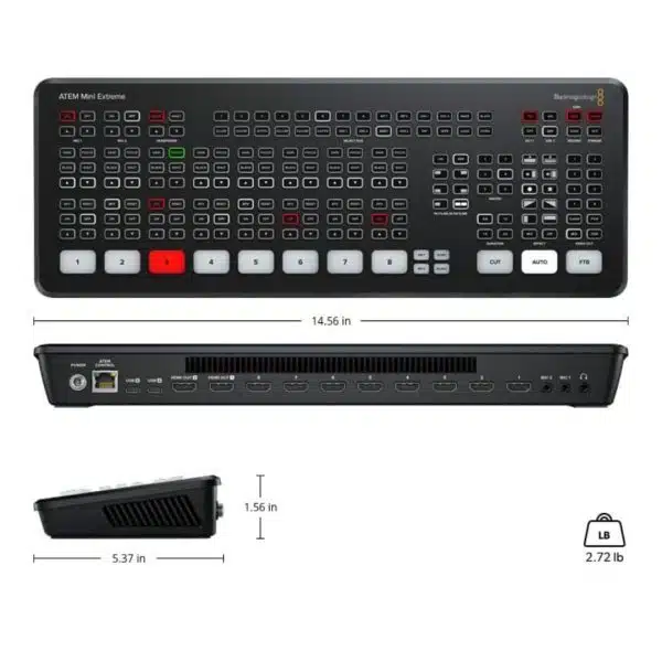 ATEM Mini Extreme 導播台專業級型號,搭載8軌HDMI輸入、16格分割畫面、4個進階Chroma keyer(刪除背景/去背合成)、四個額外的DVE’s、2軌HDMI輸入、2個USB孔與更強大的控制面板。